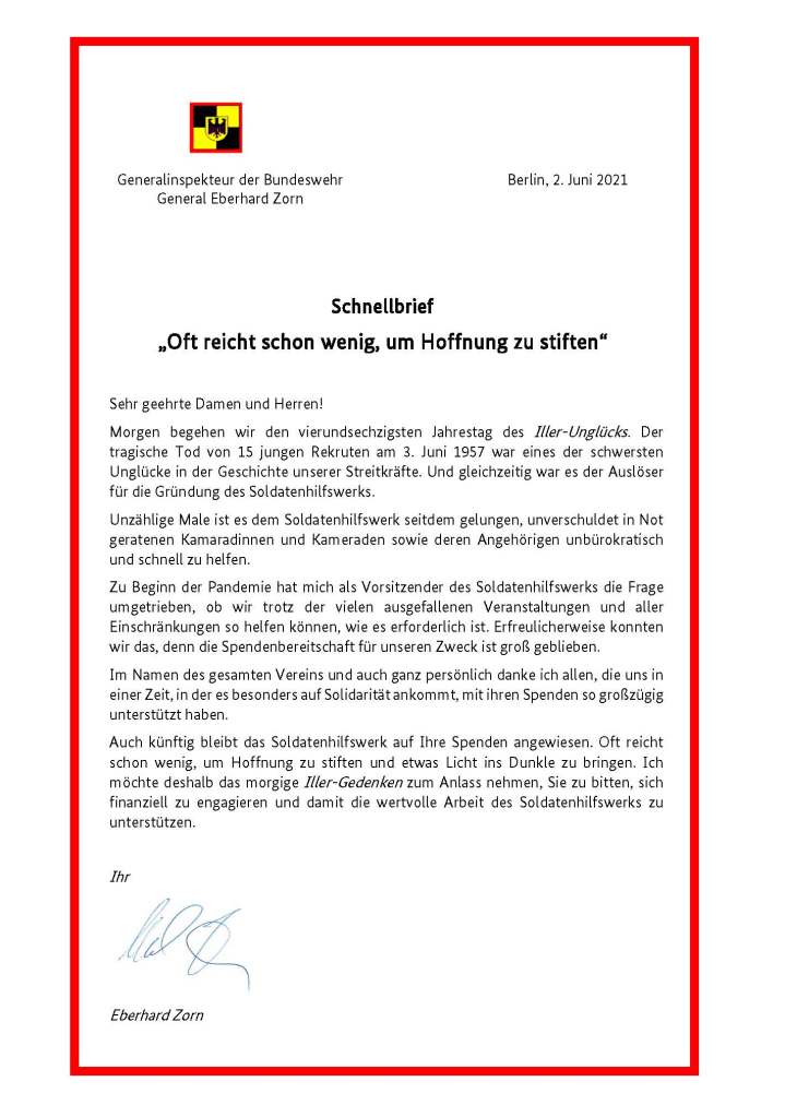 Am 02. Juni 2021 hat der Generalinspekteur der Bundeswehr, Herr General Eberhard Zorn, mit einem Schnellbrief an die Truppe zur Unterstützung des Soldatenhilfswerkes aufgerufen. Damit ist der „Startschuss“ für die diesjährige Spendensammelaktionen innerhalb der Einheiten der Bundeswehr erfolgt. Es sollte eine Selbstverständlichkeit sein, dass die Soldaten Spenden an Ihre Selbsthilfeorganisation geben, damit diese ihre Aufgaben erfüllen und unverschuldet in Not geratene Soldatinnen und Soldaten sowie deren Familien unterstützen kann.