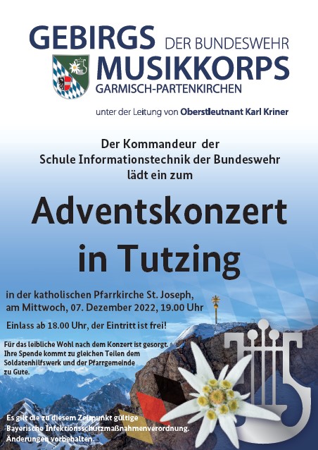 An dieser Stelle möchten wir auf eine Veranstaltung in Tutzing am 7. Dezember 2022, zu der der Kommandeur der Schule Informationstechnik der Bundeswehr einlädt, hinweisen. Für die musikalische Unterhaltung sorgt das Gebirgsmusikkorps der Bundeswehr. Der Eintritt ist frei, eine Spende aber gern gesehen, die dann zu gleichen Teilen der Pfarrgemeinde Tutzing und dem Soldatenhilfswerk der Bundeswehr zu Gute kommt.