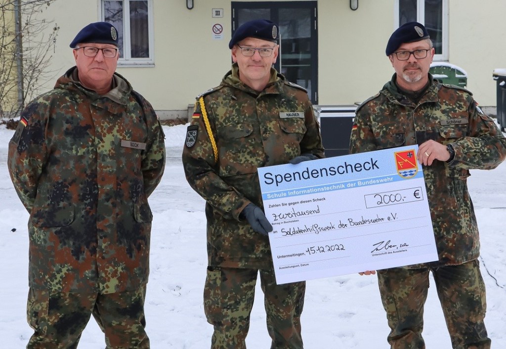…bekommen wir – das Soldatenhilfswerk der Bundeswehr e.V. – eine Spende von der IV. Inspektion der Schule Informationstechnik der Bundeswehr. So wurden auch in diesem Jahr wieder Pfandsammlungen durgeführt und Spenden von Trainingsteilnehmern und vom Stammpersonal gesammelt. Auf diesem Wege kam die stolze Summe von € 2.000,00 zusammen, die dann traditionell in der Vorweihnachtszeit – in diesem Jahr im Rahmen eines Beförderungsappells – an unser Mitglied vor Ort, Herrn Stabsfeldwebel Robert Hauber, übergeben wurde.