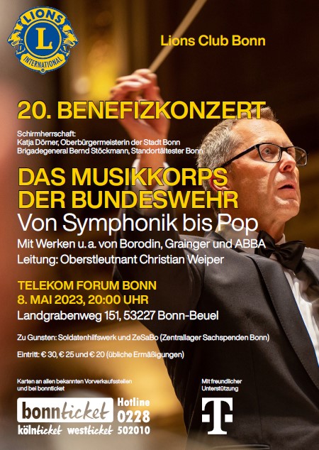 Am 8. Mai 2023 ist es wieder soweit. Nach der Corona-bedingten Pause veranstaltet der Lions Club Bonn unter der Schirmherrschaft von Oberbürgermeisterin der Stadt Bonn – Frau Katja Dörner – und dem Standortältesten Bonn – Herrn Brigadegeneral Bernd Stöckmann – ein Benefizkonzert zugunsten des „Zentrallagers Sachspenden Bonn“ und dem Soldatenhilfswerk der Bundeswehr e.V.. Musikalisch wird das Konzert gestaltet durch das Musikkorps der Bundeswehr aus Siegburg unter der Leitung von Herrn Oberstleutnant Christian Weiper. Unter dem Motto „Von Symphonik bis Pop“ werden Werke u.a. von Borodin, Grainger und Abba dargeboten. Austragungsort ist das Telekom-Forum in Bonn, Landgrabenweg 151, und die Karten sind ab 1. März 2023 an allen bekannten Vorverkaufsstellen als auch bei bonnticket (Veranstaltungen und Tickets in Bonn – Bonnticket.de) erhältlich. Der Veranstalter hofft auf zahlreiche Besucher, um so, wie in der Vergangenheit auch, die o.a. Organisationen unterstützen zu können.