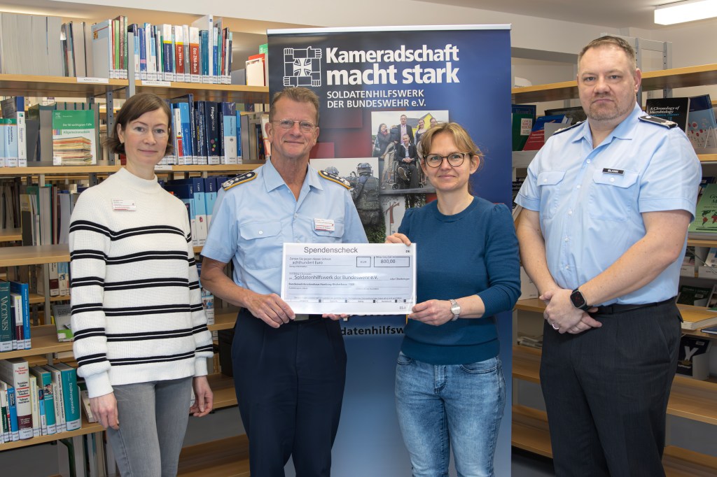Gemeinsam mit dem Kommandeur und Ärztlichen Direktor des Bundeswehrkrankenhauses Hamburg, Oberstarzt Dr. Thomas Harbaum, übergab das Team der Bibliothek den Spendenscheck in Höhe von 800,00 EUR an Major Dr.-Ing. Dennis Blank, der die Spende stellvertretend für das Soldatenhilfswerk der Bundeswehr e.V. entgegennahm.