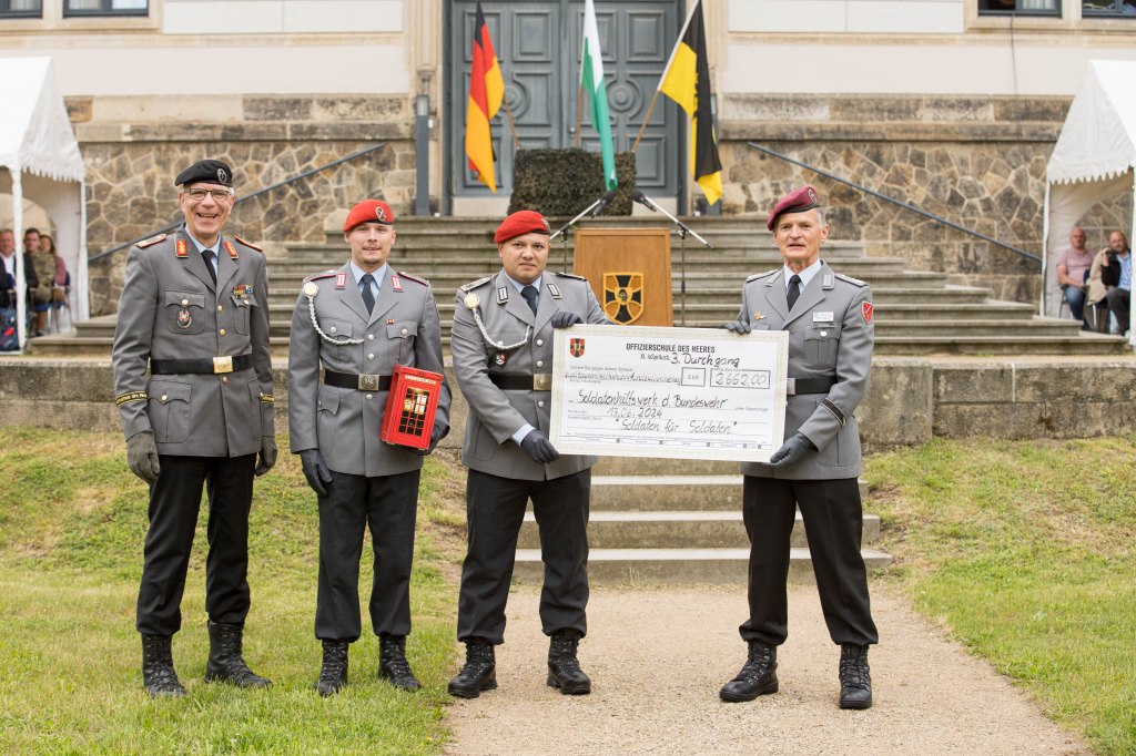Anlässlich des Appells zu Ihrer Beförderung zum Fahnenjunker durch den Kommandeurs der Offizierschule des Heeres Herrn Brigadegeneral Rohde im Ehrenhain der Offizierschule des Heeres in Dresden übergaben die Vertrauenspersonen Oberstabsgefreiter (OA) Hermann und Oberfähnrich Jäger, beide Lehrgangsteilnehmer des III. Durchgang 2024 „Sprachausbildung Englisch“, das stolze Sammelergebnis von 2662 Euro im berühmten „Roten Telefonhäuschen“ an den Vertreter des Soldatenhilfswerkes am Standort Dresden, Herrn Oberstleutnant Seifert.
