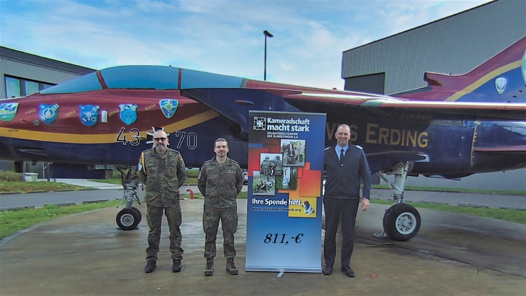 Das Instandsetzungszentrum 11 als Teil des WaSysUstgZ 1 ist ein Filetstück der militärischen Luftfahrzeuginstandsetzung mit vielen hochausgebildeten Fachkräften. Seit dem Umzug 2021 von Erding nach Manching ist die Einheit im Herzen der militärischen Luftfahrzeugbranche zwischen Airbus und der WTD 61 stationiert. Doch nicht nur das Wohl der Luftfahrzeuge liegt den Technikerinnen und Technikern am Herzen sondern auch die fast schon zur Tradition gewordene jährliche Unterstützung des Soldatenhilfswerkes der Bundeswehr. Als langjähriges aktives Mitglied des Vereins freut es StFw Christian Thies dieses Jahr wieder einen Spendenscheck entgegen nehmen zu dürfen. Der stolze Betrag von 811€ wurde durch den Dienststellenleiter OTL Swen Wegler und dem Spieß des InstZ 11 StFw Christian Papperger an StFw Thies übergeben. Gesammelt wurde der Betrag bei verschiedenen Veranstaltungen innerhalb der Dienststelle. StFw Thies bedankt sich im Namen des SHW bei allen die zu dieser herausragenden Spende beigetragen haben.“ (Text und Bild InstZ 11)