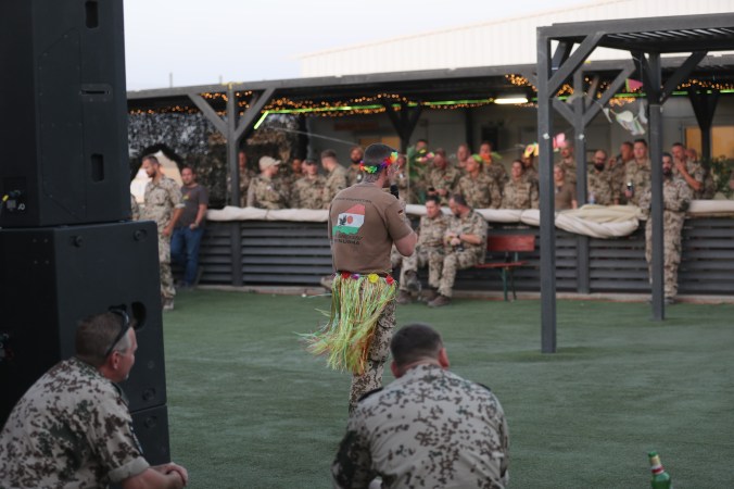 Beim Kontingentfest konnten die Soldatinnen und Soldaten im Einsatz, die sonst 7 Tage die Woche zu 100% auf die jeweilige Aufgabe fokussiert sein müssen, gelebte Kameradschaft mit Bratwurst und Bier aus der Heimat genießen. Gerade bei einem solchen Fest denken sie aber auch an andere – allerdings nicht nur die Angehörigen daheim, sondern vor allem auch an Kameradinnen und Kameraden, die plötzlich in unverschuldete Not geraten sind. In solchen Fällen hilft das Soldatenhilfswerk schnell und unbürokratisch. Ebenso unbürokratisch kam der Beitrag des Einsatzkontingents zusammen, der für diesen Zweck gesammelt wurde. Der Abend wurde musikalisch begleitet durch die Band „Emsperlen“. Sie legten die Basis für eine Auktion mit vielen unterschiedlichen Highlights. Es gab einmalige, handsignierte Trikots bekannter Bundesligavereine, „ein Tag als Spieß“, „ein Tag als COM“ oder das Kontingentwappen als edle Handarbeit in Holz. Schon bei der Erstellung der Preise haben sich einzelne Soldatinnen und Soldaten mit Eifer hervorgetan, um möglichst attraktive Preise anbieten zu können. Denn so war die Wahrscheinlichkeit höher, dass eine beträchtliche Summe erzielt wurde. Moderiert wurde die Versteigerung von Stabsunteroffizier S., der sich sehr talentiert zeigte, den Bietern gut zuzureden, warum sie genau diesen Preis ersteigern sollten.