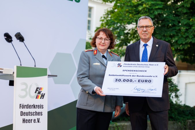 Das Soldatenhilfswerk der Bundeswehr blickt auf eine lange und vertrauensvolle Partnerschaft mit dem Förderkreis Deutsches Heer e.V. (FKH) zurück. Seit Jahrzehnten engagiert sich der FKH verlässlich für die Belange von Soldatinnen und Soldaten sowie ihrer Familien. Anlässlich seines 30-jährigen Jubiläums rief der FKH seine Mitgliedsunternehmen zu einer Spendenaktion zugunsten des Soldatenhilfswerks auf. Die Resonanz war beeindruckend: Insgesamt kamen 30.000 Euro zusammen, die beim Berlin-Empfang des FKH am 25. Juni 2025 in Form eines Spendenschecks übergeben wurden. In Vertretung des Soldatenhilfswerks nahm Frau Generalstabsarzt Dr. Almut Nolte, stellvertretende Vorsitzende des Vereins, die Spende entgegen. Die Spendenübergabe ist ein kraftvolles Signal der Verbundenheit mit all jenen, die im Dienst der Bundeswehr Verantwortung für unser Land tragen. (Text und Bild: Förderkreis Deutsches Heer e.V.)