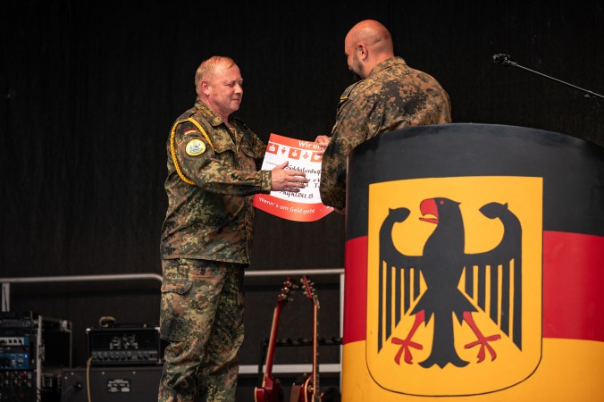 Im Rahmen der Abschlussrede überreichte der Kommandeur des Aufklärungsbataillons 8, Herr OTL Dr. Dan Tomuzia, den Hauptpreis und den Spendenscheck (siehe Bilder). Zum Zeitpunkt der Scheckübergabe betrug der Spendenwert noch 9.200,- Euro, dieser Betrag wurde im Nachhinein noch durch weitere Geldspenden ergänzt. (Text und Bilder: Hauptmann Alexander R. vom Aufklärungsbataillon 8)