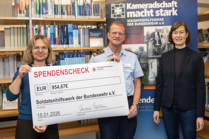 Gemeinsam mit dem Kommandeur und Ärztlichen Direktor des Bundeswehrkrankenhauses Hamburg, Generalarzt Dr. Thomas Harbaum, übergab das Team der Bibliothek den Spendenscheck in Höhe von 954,67 EUR an das Soldatenhilfswerk der Bundeswehr e.V. (Text: Christine Guntermann, Foto: Sandra Herholt)