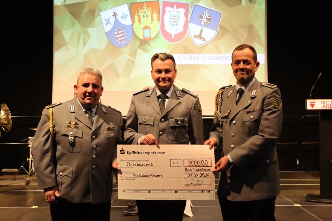 Im Rahmen des Neujahrsempfang in BAD FRANKENHAUSEN am 21. Januar 2026 wurde durch Herrn Oberstleutnant Gero SOJKA (Kommandeur Versorgungsbataillon 131 u. Standortältester Bad Frankenhausen, Bild Mitte) sowie Herrn Oberstabsfeldwebel Maik BELLETTI (Kompaniefeldwebel 1./Versorgungsbataillon 131, Bild links) ein Spendenscheck in Höhe von 3000,00€ an den Beauftragten des Soldatenhilfswerk der Bundeswehr am Standort, Herrn Oberstabsfeldwebel André PAUL (Kompaniefeldwebel 5./Versorgungsbataillon 131, Bild rechts) überreicht. Die Summe kam zum einen aus den Erlösen des Weihnachtsmarkts am 10. Dezember 2025 sowie den Erlösen des Adventskonzert in BAD FRANKENHAUSEN am 17. Dezember 2025 zusammen. Oberstabsfeldwebel Paul bedankte sich bei Oberstleutnant SOJKA sowie bei allen Kameradinnen und Kameraden insbesondere allen Kompaniefeldwebeln am Standort für die tolle Organisation der Veranstaltungen. Die Dienststellen am Standort BAD FRANKENHAUSEN sind seit Jahren ein Garant für tolle Spendenergebnisse für die gute Sache. (Text u. Bild Versorgungsbataillon 131)
