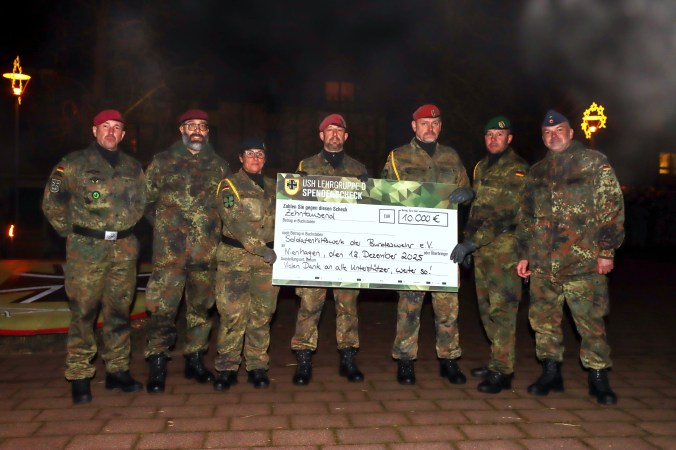 Im Rahmen des Abschlussappells der Lehrgruppe am 18.12.2025 auf dem Marktplatz in Nienhagen konnte so im Beisein des Lehrgruppenkommandeurs, Herrn Oberstleutnant Holzapfel, ein herausragender Erlös von 10.000 Euro an die Vertreter vom Soldatenhilfswerk übergeben werden. (Text: StFw Kleist, Foto: Benjamin Jörß)