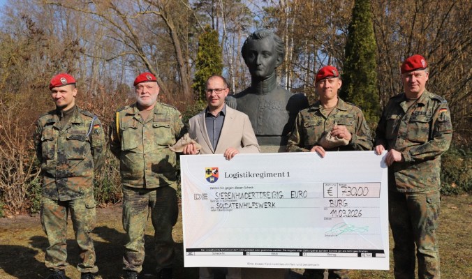 Am 11. März 2026 haben der Kompaniechef der Stabskompanie des Logistikregiments 1 “Clausewitz“ Major Max M. und dessen Kompaniefeldwebel Oberstabsfeldwebel Jens L. einen Spendencheck an die Stadt Burg und an das Soldatenhilfswerk übergeben.